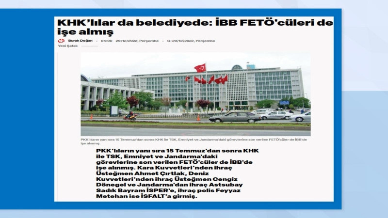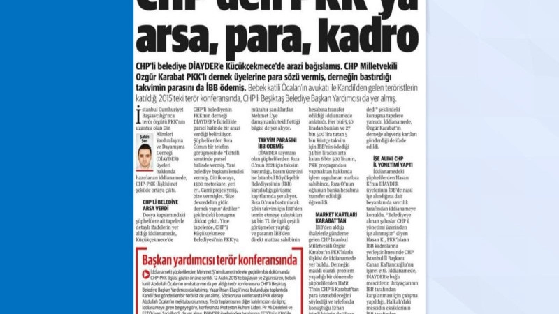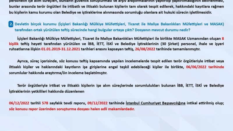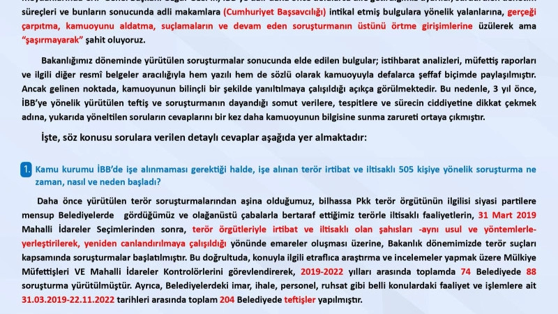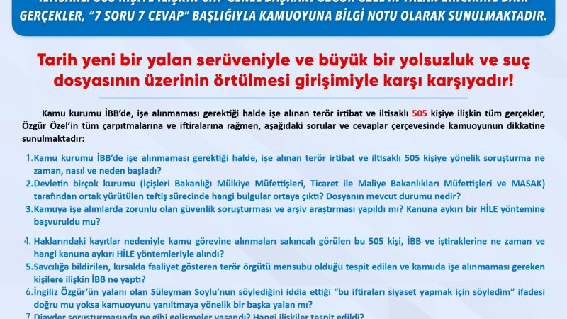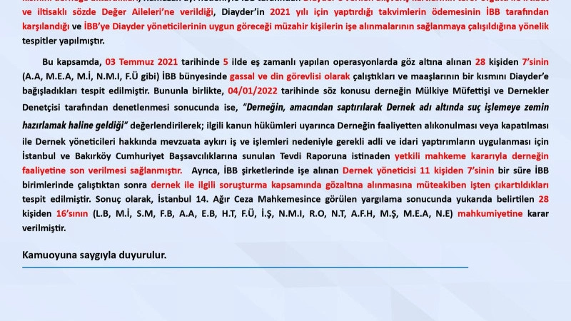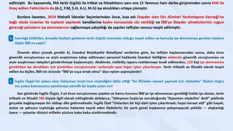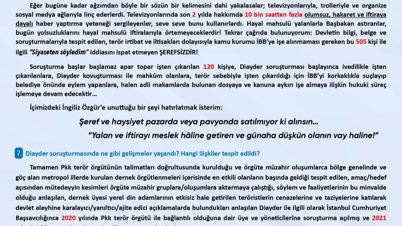 "Hayal mahsulü yalanlarla Başbakan astıranlar bugün yolsuzluklarını hayal mahsulü iftiralarıyla örtemeyeceklerdir. Tekrar çağrıda bulunuyorum: Devletin bilgi, belge ve soruşturmalarıyla tespit edilen, terör irtibat ve iltisakları dolayısıyla kamu kurumu İBB'de işe alınmaması gereken bu 505 kişiyle ilgili 'siyaseten söyledim' iddiasını ispat etmeyen şerefsizdir. Soruşturma başlar başlamaz apar topar işten çıkarılan 120 kişiye, Diayder soruşturması başlayınca ivedilikle işten çıkarılanlara, Diayder kovuşturması ile mahkum olanlara, terör sebebiyle işten çıkarıldığı için İBB'yi korkaklıkla suçlayıp belediye önünde eylem yapanlara, halen adli makamlarda bulunan dosyaya ve kanuna aykırı işe almaya ilişkin hukuki süreç işlemeye devam edecektir."