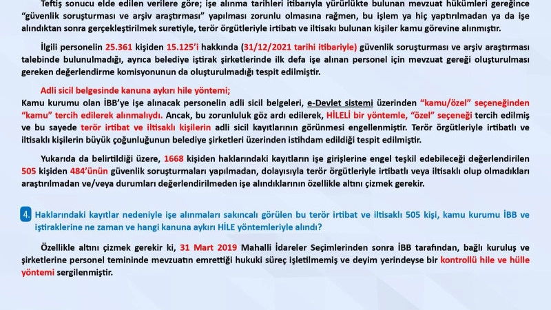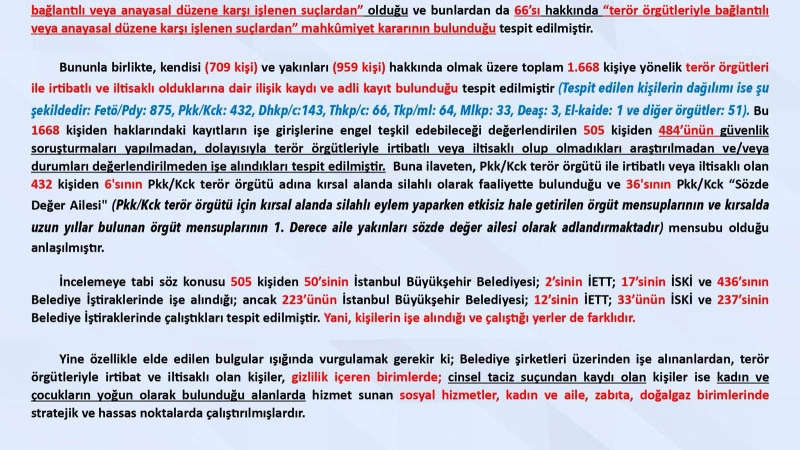 "Toplam 1668 kişiye yönelik terör örgütleri ile irtibatlı ve iltisaklı olduklarına dair ilişik kaydı ve adli kayıt bulunduğu tespit edilmiştir. Bu 1668 kişiden haklarındaki kayıtların işe girişlerine engel teşkil edebileceği değerlendirilen 505 kişiden 484'ünün güvenlik soruşturmaları yapılmadan, dolayısıyla terör örgütleriyle irtibatlı veya iltisaklı olup olmadıkları araştırılmadan ve/veya durumları değerlendirilmeden işe alındıkları tespit edilmiştir."