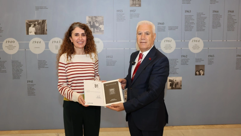 Ziyaretin sonunda Başkan Mustafa Bozbey, sergiye katkılarından dolayı Küratör Yasemin Bay’a hediye verdi.