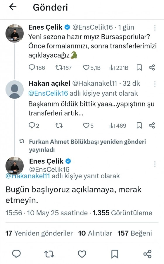 Bursaspor Başkanı Enes Çelik'ten taraftarları heyecanlandıran açıklama geldi. Çelik, transfer duyurularıyla ilgili "Bugün başlıyoruz açıklamaya, merak etmeyin" ifadelerini kullandı.