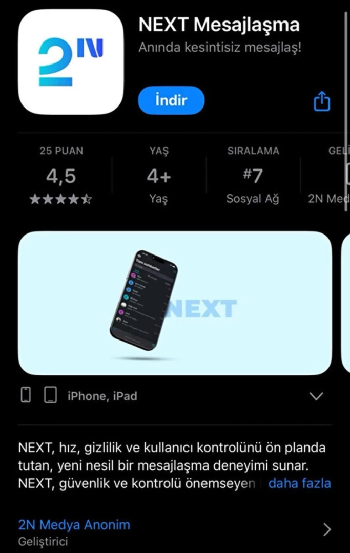Bayraktar'ın açıklaması sonrası uygulama marketinde "Next Mesajlaşma" ismiyle kullanıma açılan bir uygulama olduğu görüldü.