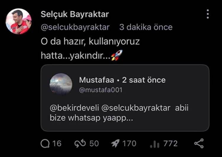 Bir vatandaşın Next Sosyal hesabından yaptığı 'WhatsApp benzeri uygulama' isteğine yanıt veren Bayraktar, "O hazır, kullanıyoruz hatta... Yakındır..." ifadelerini kullandı.